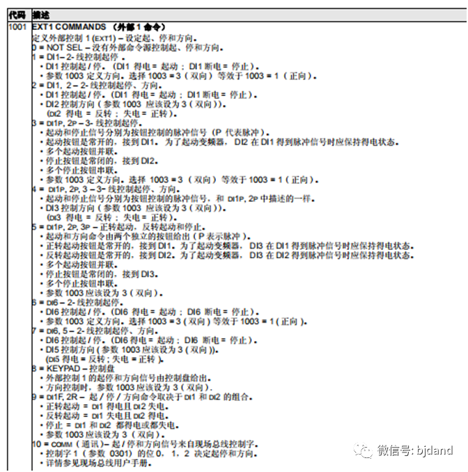 變頻器調(diào)試過程中,必須確保參數(shù)設(shè)置和端子接線的對(duì)應(yīng)。下面是ACS510啟動(dòng)/停止/方向參數(shù)的設(shè)置選項(xiàng),任何一個(gè)選項(xiàng)都可以實(shí)現(xiàn)對(duì)變頻器外部控制1的運(yùn)行/停止/方向控制。