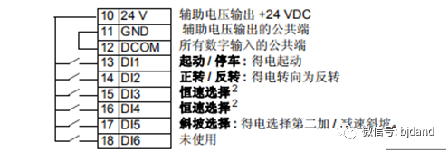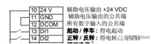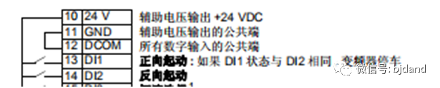 舉例3:如果變頻器的啟動(dòng)/停止/方向控制信號(hào)接到13號(hào)(DI1)和14號(hào)(DI2),其中DI1作為正向啟動(dòng),DI2作為反向啟動(dòng).當(dāng)DI1置高電平后,變頻器啟動(dòng)運(yùn)行一個(gè)方向。DI1置低電平后變頻器停止。當(dāng)DI2置高電平后,變頻器運(yùn)行另一個(gè)方向。DI2置低電平后變頻器停止。