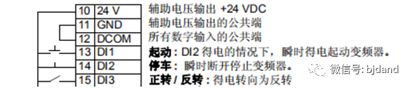 舉例2:如果變頻器的啟動(dòng)/停止/方向控制信號(hào)接到13號(hào)(DI1)和14號(hào)(DI2)及15號(hào)(DI3),其中DI2接常閉按鈕作為停止,DI1接常開按鈕作為啟動(dòng),DI3接開關(guān)。當(dāng)DI1收到脈沖后,變頻器啟動(dòng)運(yùn)行一個(gè)方向。DI3置高電平時(shí),變頻器運(yùn)行另外一個(gè)方向。當(dāng)DI2(常閉)打開時(shí),變頻器停止運(yùn)行。