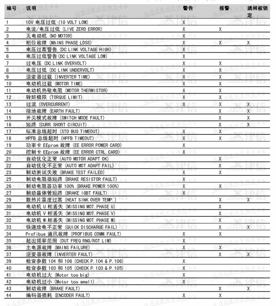 上表中,如果在警告和報(bào)警下面都標(biāo)有叉號(hào),表示先給出警告,再給出報(bào)警。這種情況還表示可以設(shè)定特定故障是否會(huì)導(dǎo)致警告或報(bào)警。例如,在參數(shù)404 制動(dòng)檢查中就可以進(jìn)行這種設(shè)定。在跳閘后,報(bào)警和警告都將閃爍,但在故障排除后,只有報(bào)警還將繼續(xù)閃爍。復(fù)位后,變頻器就已準(zhǔn)備好再次開始運(yùn)行了。