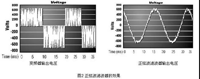 解決電機(jī)過熱的方法是減小電機(jī)驅(qū)動(dòng)電壓中的高頻成份。實(shí)現(xiàn)這個(gè)目的方法是在變頻器的輸出端安裝SWF正弦波濾波器。正弦波濾波器將PWM電壓波形變換成適應(yīng)于電機(jī)的正弦波電壓波形,如圖2所示,從而消除了電機(jī)過熱的現(xiàn)象。