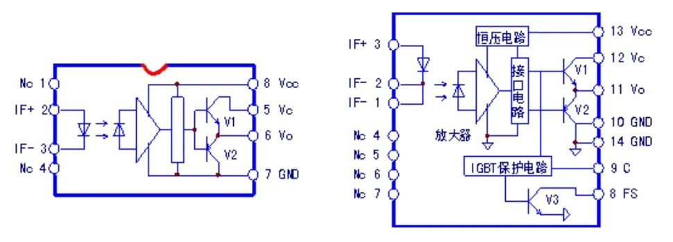 PC923是8腳封裝的光耦芯片,一般用于上三橋IGBT的驅(qū)動(dòng)。PC929則為16腳封裝,用于驅(qū)動(dòng)下三橋IGBT,因?yàn)镻C929帶有IGBT保護(hù)電路和OC信號(hào)輸出電路,下三橋IGBT發(fā)射極Vce共用直流母線的負(fù)極,更方便于檢測(cè)IGBT導(dǎo)通管壓降,從而實(shí)現(xiàn)過流保護(hù)和輸出報(bào)警信號(hào)的任務(wù)。