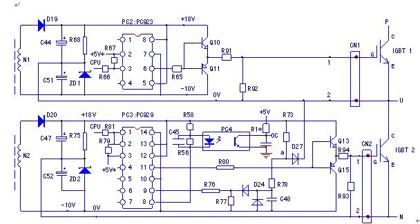 PC929驅(qū)動(dòng)IC是兼有對(duì)驅(qū)動(dòng)脈沖隔離放大和模塊故障檢測(cè)雙重“身份”的。由CPU主板來的脈沖信號(hào)從1/2、3腳輸入到PC929內(nèi)部的光電耦合器,從11腳輸出后,經(jīng)Q13、Q15兩級(jí)互補(bǔ)式電壓跟隨器的功率放大后,引入IGBT2的G極。此為驅(qū)動(dòng)脈沖的信號(hào)傳輸電路路;?PC929的9腳為模塊故障檢測(cè)信號(hào)輸入腳。正常工作狀態(tài)下,PC929的11腳輸出正的激勵(lì)脈沖電壓,使Q13導(dǎo)通,Q15截止。Q13的導(dǎo)通,將正偏壓加到IGBT2的G極上,IGBT2進(jìn)入飽合開通狀態(tài)。忽略IGBT導(dǎo)通管壓降的話,IGBT2的導(dǎo)通即將U輸出端與負(fù)直流供電端N短接起來,提供輸出交流電壓的負(fù)半波通路,在導(dǎo)通期間,只要變頻器是在額定電流以內(nèi)運(yùn)行,IGBT2的正常管壓降應(yīng)在3V以下。