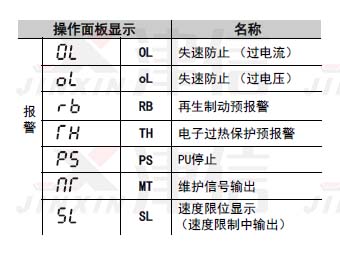 三菱變頻器報警信息包括OL失速防止 (過電流) , oL失速防止 (過電壓), RB再生制動預報警,TH電子過熱保護預報警 PSPU停止,MT維護信號輸出,SL速度限位顯示