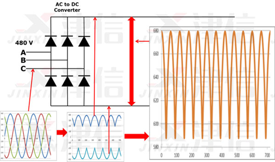 我們假設(shè)驅(qū)動器在480V電源系統(tǒng)上運行。480V等級為均方根。480V系統(tǒng)的峰值為679V。如您所見,變頻器直流總線具有帶交流紋波的直流電壓。電壓在大約580V和680V之間。