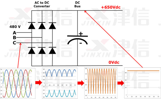 我們可以通過增加一個電容來消除直流母線上的交流紋波。電容器以類似于管道系統(tǒng)中的儲存器或蓄電池的方式操作。該電容吸收交流紋波并提供平滑的直流電壓。直流母線上的交流紋波通常小于3伏。因此,DC總線上的電壓變?yōu)榇蠹s650VDC。實際電壓取決于為變頻器供電的交流線路的電壓水平,電力系統(tǒng)的電壓不平衡水平,電機負(fù)載,電力系統(tǒng)的阻抗以及變頻器上的任何電抗器或諧波濾波器。