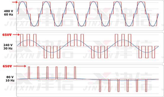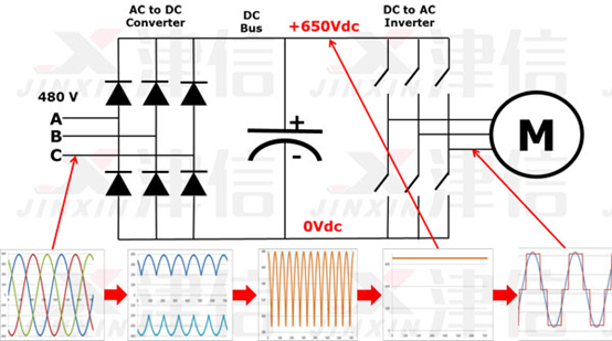 請注意,變頻器的輸出是“矩形”波形。變頻器不產(chǎn)生正弦輸出。對于通用配電系統(tǒng),這種矩形波形不是一個好的選擇,但對于電機來說是完全合適的。