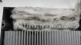 紡織行業(yè)和玻璃纖維行業(yè),粉塵以絨毛和纖維的形式出現(xiàn),生產(chǎn)過(guò)程中產(chǎn)生的微小的毛經(jīng)由變頻器的氣流通道進(jìn)入到設(shè)備的內(nèi)部。而且由于絨毛相較于塵埃的更大的雜物,會(huì)更容易夾在散熱器或空氣過(guò)濾器上,或是纏在風(fēng)扇上。同時(shí)由于絨毛的特性會(huì)更容易吸引其它的纖維纏繞其上,這樣的情況在嚴(yán)重的狀態(tài)下幾乎可以完全阻塞變頻器的空氣流動(dòng)通道。