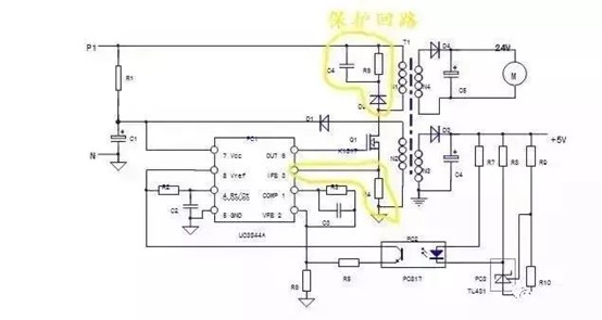3、保護回路:PC1芯片本身和3腳外圍元件R4構(gòu)成過電流保護回路;N1繞組上并聯(lián)的D2,R6,C4元件構(gòu)成了開關(guān)管的反壓吸收保護電路;實質(zhì)上穩(wěn)壓回路的電壓反饋信號——穩(wěn)壓信號,也可看作一路電壓保護信號,但保護電路的內(nèi)容并不僅是局限于保護電路本身,保護電路的啟控往往是由于負載電路異常所引起的。