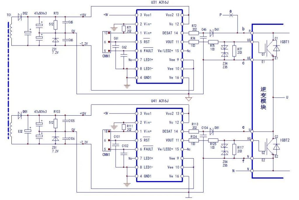 一臺(tái)阿爾法變頻器,畫出U相上下臂IGBT的驅(qū)動(dòng)電路圖,可以看到,每相下臂IGBT的驅(qū)動(dòng)電路共用D51、E32直流電源。驅(qū)動(dòng)供電也由穩(wěn)壓電路分為+15V和-7.2V兩路電源,以形成對(duì)IGBT供電的+15V激勵(lì)電壓回路和-7.2V的截止電壓回路。驅(qū)動(dòng)IC(A316J)的左側(cè)引腳為輸入側(cè)電路,右側(cè)引腳為輸出側(cè)電路。無(wú)論是脈沖信號(hào)還是OC故障信號(hào),都由內(nèi)部光耦合器電路相隔離。由PC929相比,因內(nèi)部已有對(duì)OC信號(hào)的隔離,可省去外接光耦合器,并且脈沖信號(hào)、OC信號(hào)和故障復(fù)位信號(hào)可經(jīng)控制端子CNN1直接與CPU脈沖輸出引腳相連。在有的變頻器電路中,僅是下三臂IGBT驅(qū)動(dòng)電路采用A316J,上三管采用TLP250等。